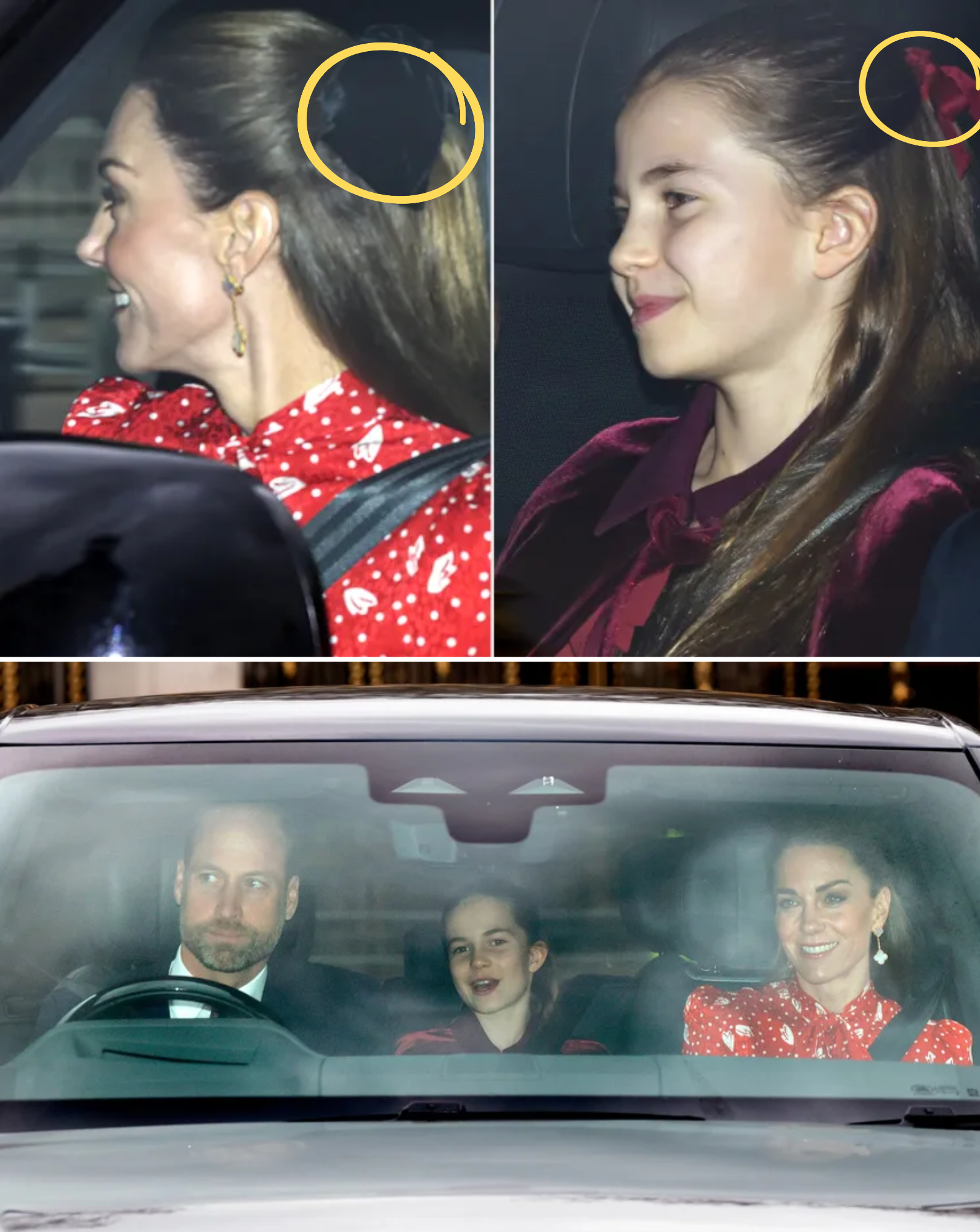 Catherine opted for a vibrant red blouse featuring a pussy-bow collar and subtle white print details, paired with a half-up hairstyle secured by a black velvet bow. Charlotte, 10, mirrored the festive theme in a burgundy coat with a classic collar, her hair styled in a similar half-updo adorned with a coordinating ribbon bow. The subtle synchronization extended to the family, with Prince William and Prince George in navy suits featuring complementary ties.
