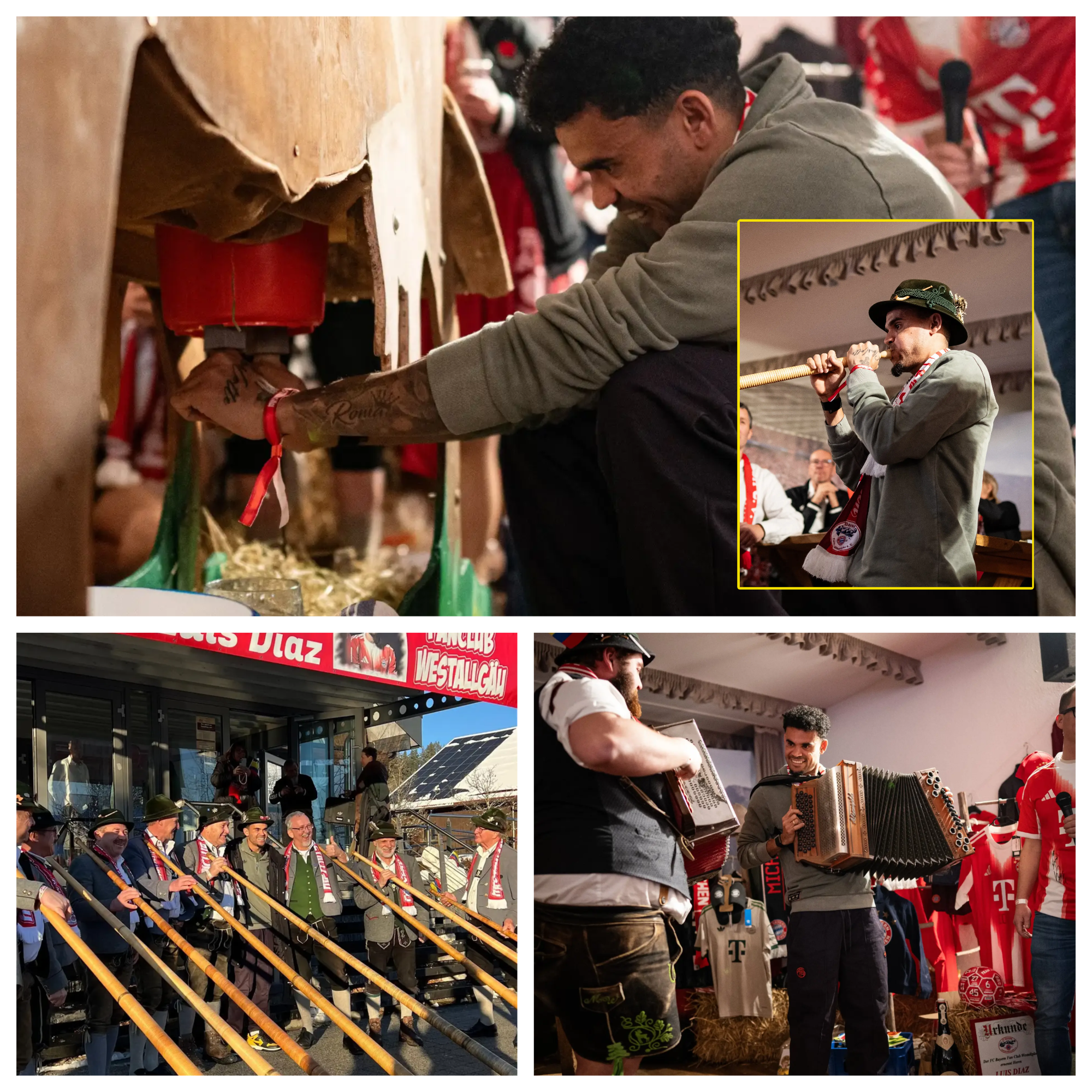 The highlight came when “Lucho” embraced local customs hands-on. In the heart of the Allgäu region—famous for its dairy farms and alpine heritage—Díaz tried milking a cow, laughing through the experience as fans cheered him on. He then picked up an alphorn, the long wooden instrument synonymous with Bavarian mountains, and gave an impressive performance, proving music runs deep in his Colombian roots. Earlier events saw him playfully handling an accordion, further delighting the crowd.