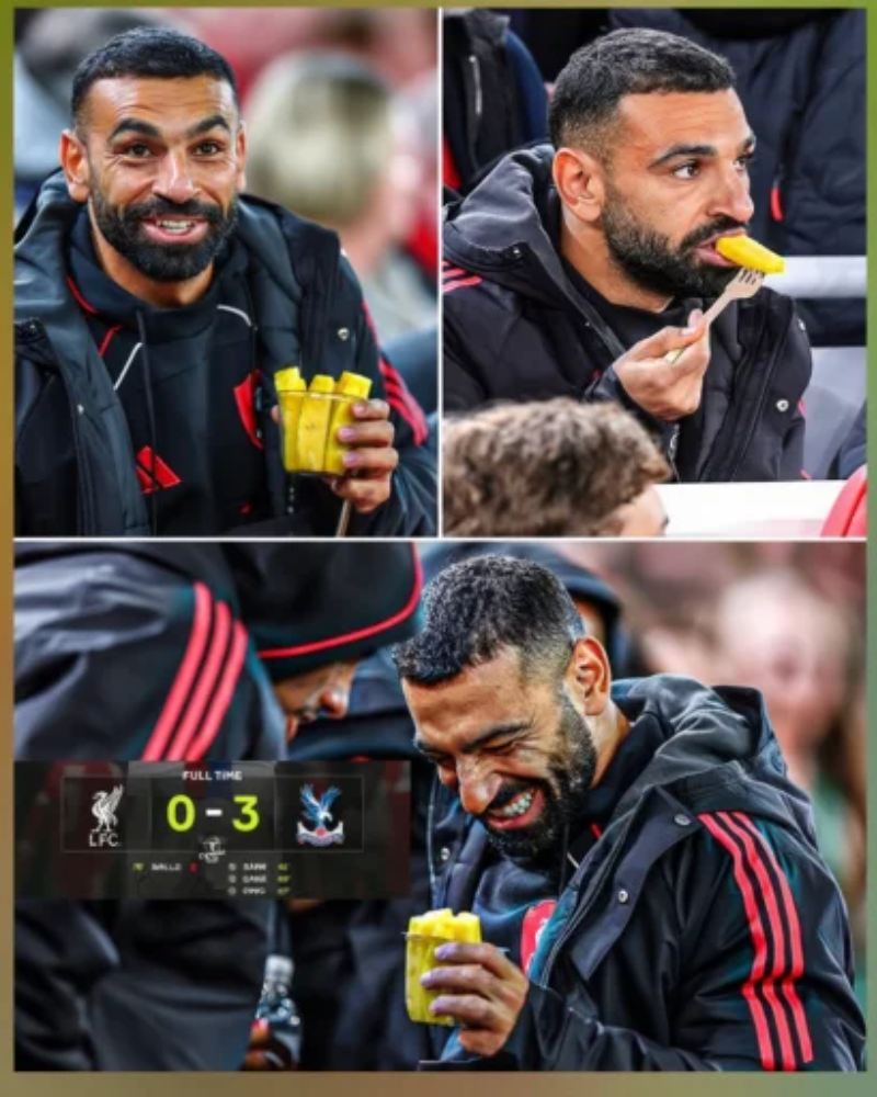 It’s a crisp evening at Anfield, the crowd’s roaring like a pack of hungry lions, and Liverpool’s pushing for that crucial win. Salah, who’s been an absolute beast this season with goals flying in left, right, and center, finds himself on the subs bench for whatever reason – maybe a tactical tweak, a minor niggle, or just giving the lads a breather. But does our man look bothered? Heck no! He’s parked there, legs crossed, eyes glued to the action, and casually snacking away like he’s at the movies.