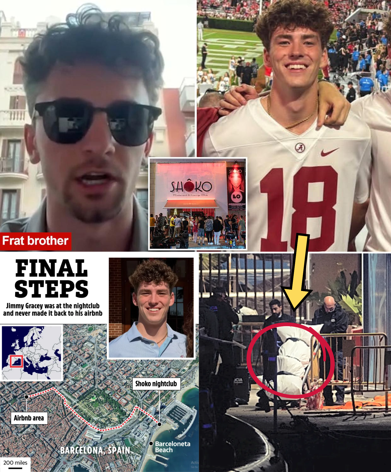 Security footage from Shoko shows Gracey leaving the club with an unidentified person around 3 a.m., after brief interactions inside with a brown-haired woman described as American. He appeared animated and engaged during the night, wearing a white t-shirt, dark pants, and a distinctive rhinestone cross necklace. Witnesses reported no signs of distress as he exited, but his path afterward led toward the beachfront rather than the group’s Airbnb on Ronda de Sant Pere. A witness later described seeing someone matching his description walking alone toward the water, though details remain vague.
