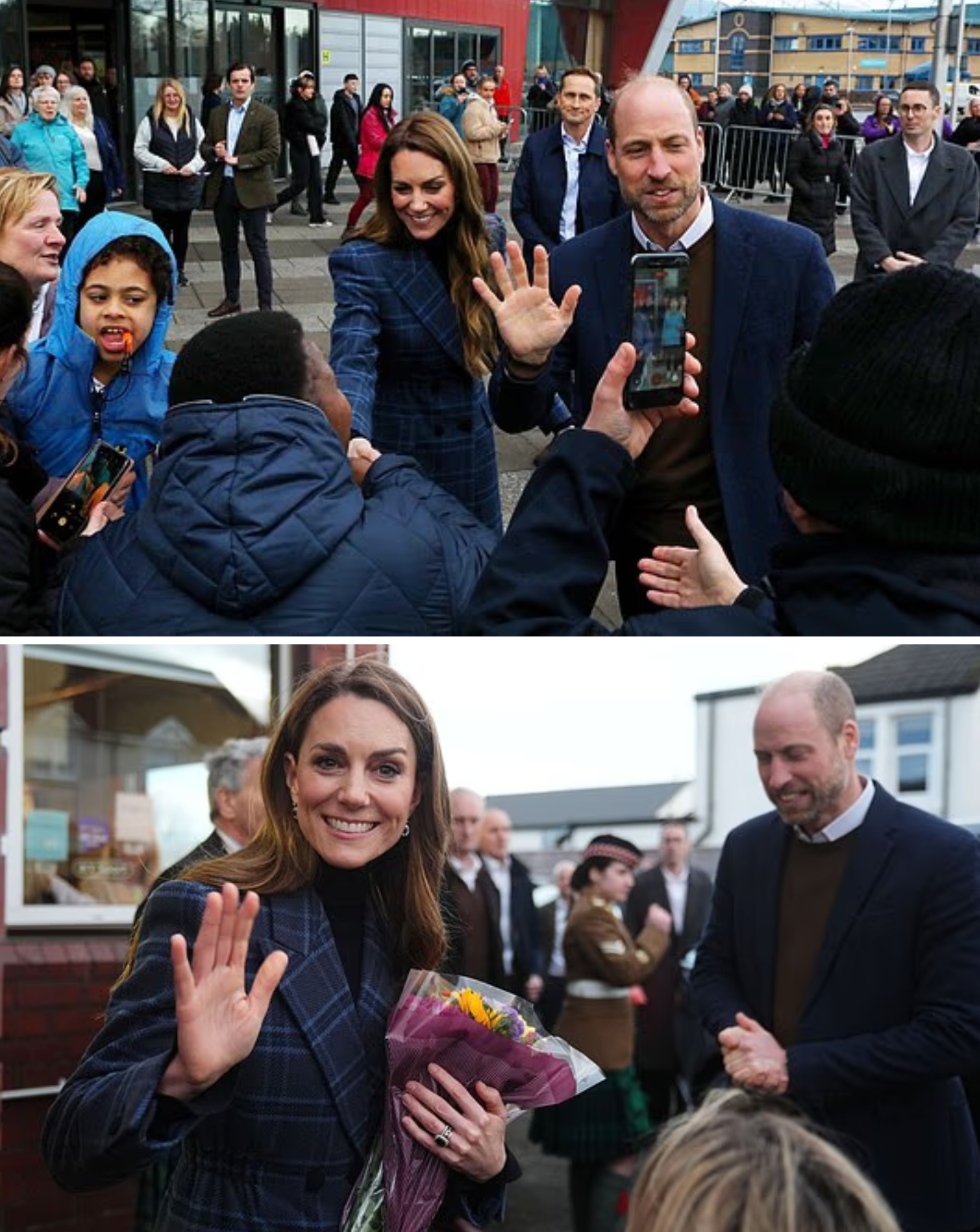 The woman, wrapped in layers against the winter wind, held a beautiful bouquet of flowers—pink roses mixed with white lilies and greenery—as Catherine approached the crowd line. The Princess immediately noticed her, broke into a wide smile, and raised her gloved hand in a gentle, enthusiastic wave that sent ripples of cheers through the gathered well-wishers. “Hello! Thank you so much for coming!” Catherine called out, her voice carrying genuine delight. The fan, visibly emotional after the long wait, thrust the bouquet forward. Catherine accepted it with both hands, bringing the flowers close to her face and inhaling deeply before turning back to the woman with sparkling eyes.
