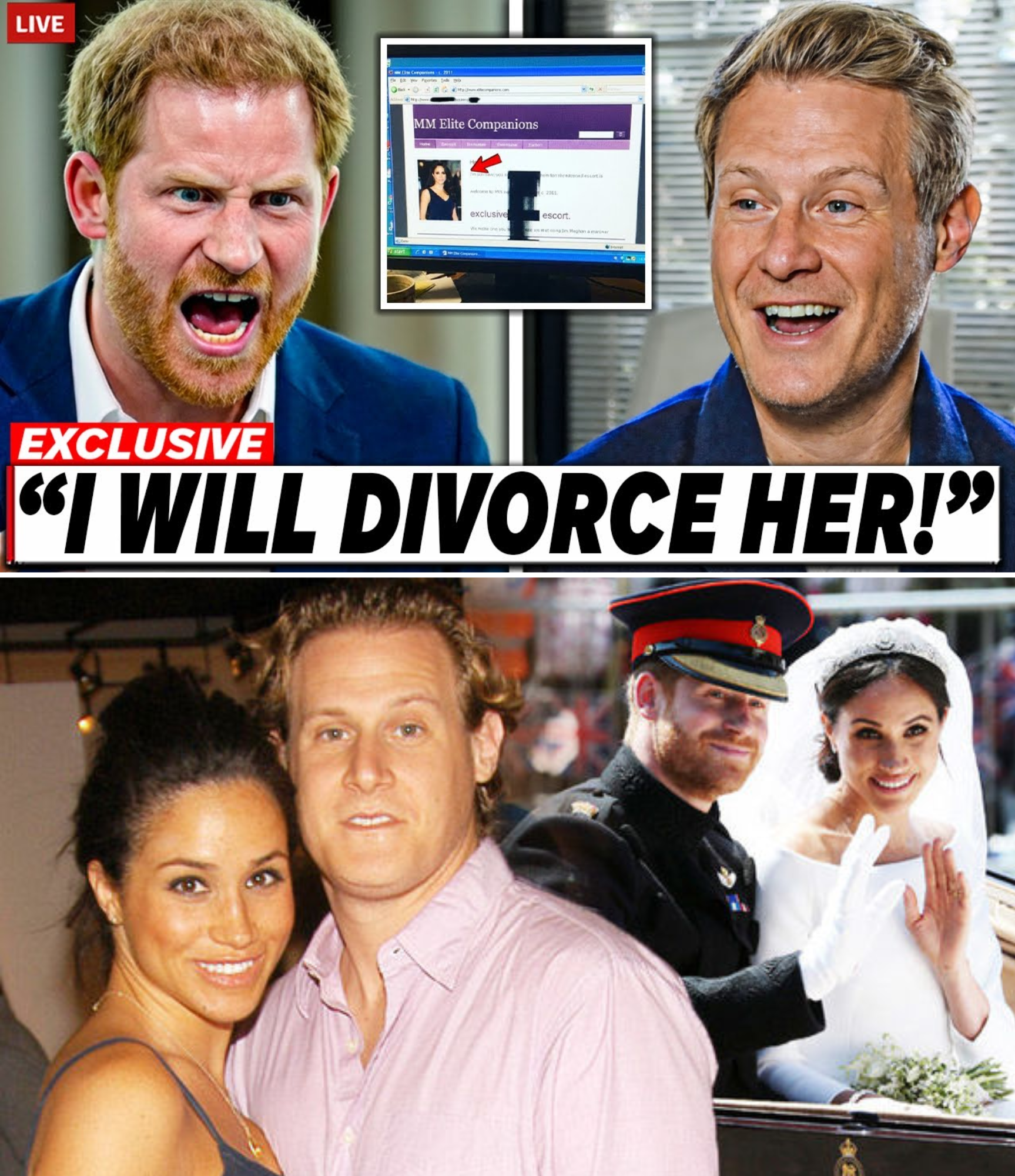 In a stunning turn of events that’s rocking the royal family to its core, Prince Harry has reportedly filed for divorce from Meghan Markle following explosive revelations from her ex-husband, Trevor Engelson, about a deleted 2011 website allegedly tied to her past. The digital archive, unearthed through forensic analysis, purportedly shows screenshots of an escort service platform linked to Meghan during her pre-fame days in Hollywood, challenging the polished narrative of her rise from actress to duchess. This scandal has thrust the “missing years” of Meghan’s career—roughly between 2003 and 2011—into the spotlight, a period shrouded in mystery where she juggled bit roles, modeling gigs, and personal upheavals before landing her breakout role on “Suits.”