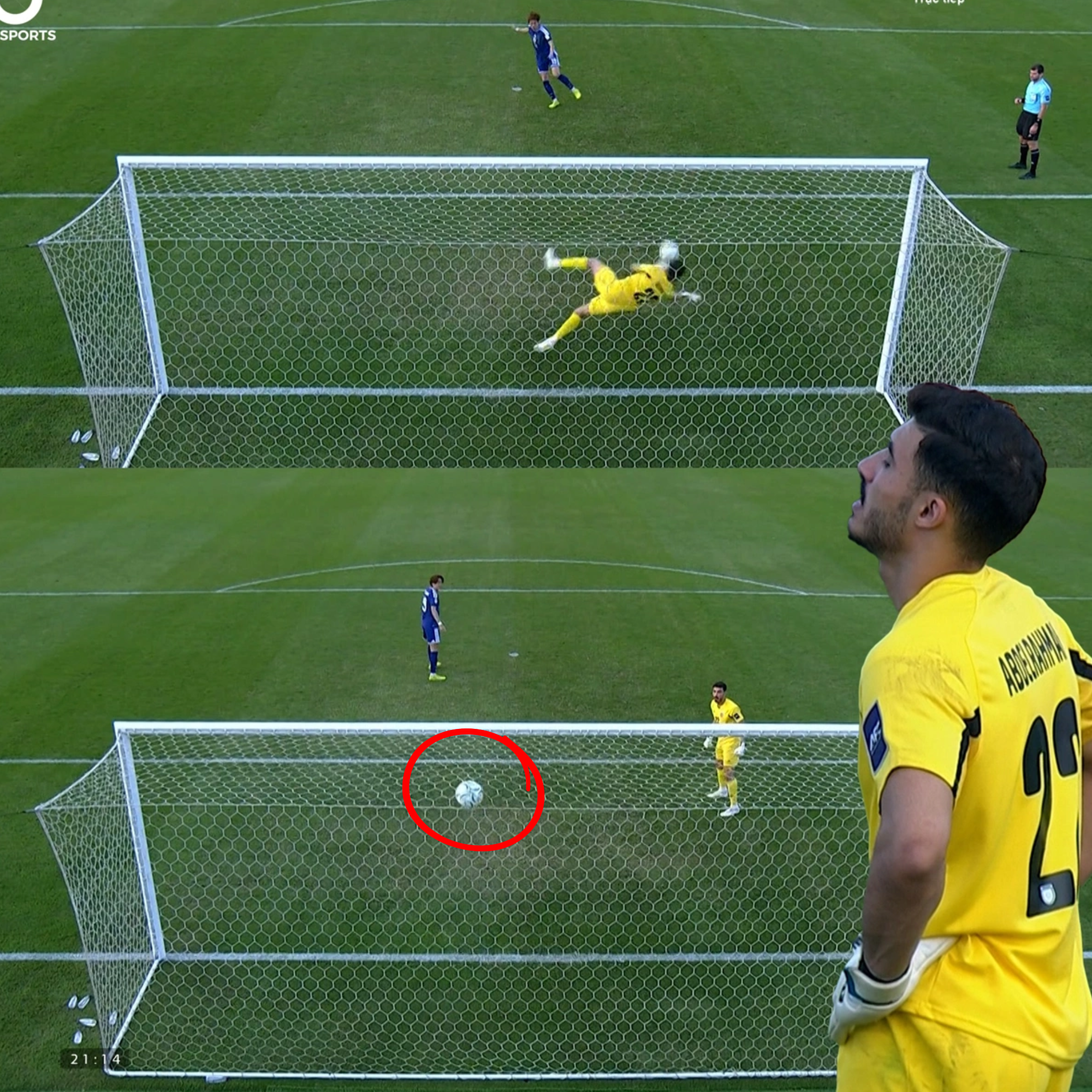 In the shootout, Japan opened with a successful kick from Rion Ichihara (1-0). Jordan’s Mohammad Taha leveled it (1-1). Then came the pivotal second kick for Japan by Yutaka Michiwaki. The shot was low and powerful toward the bottom right corner. Suleiman dove brilliantly, getting both hands to the ball and parrying it away—or so it seemed. The 22-year-old keeper (born 2003, playing for Al-Faisaly in the Jordan Pro League) immediately sprang to his feet, pumping his fists and turning toward his teammates in jubilation, convinced he had kept Jordan alive.
