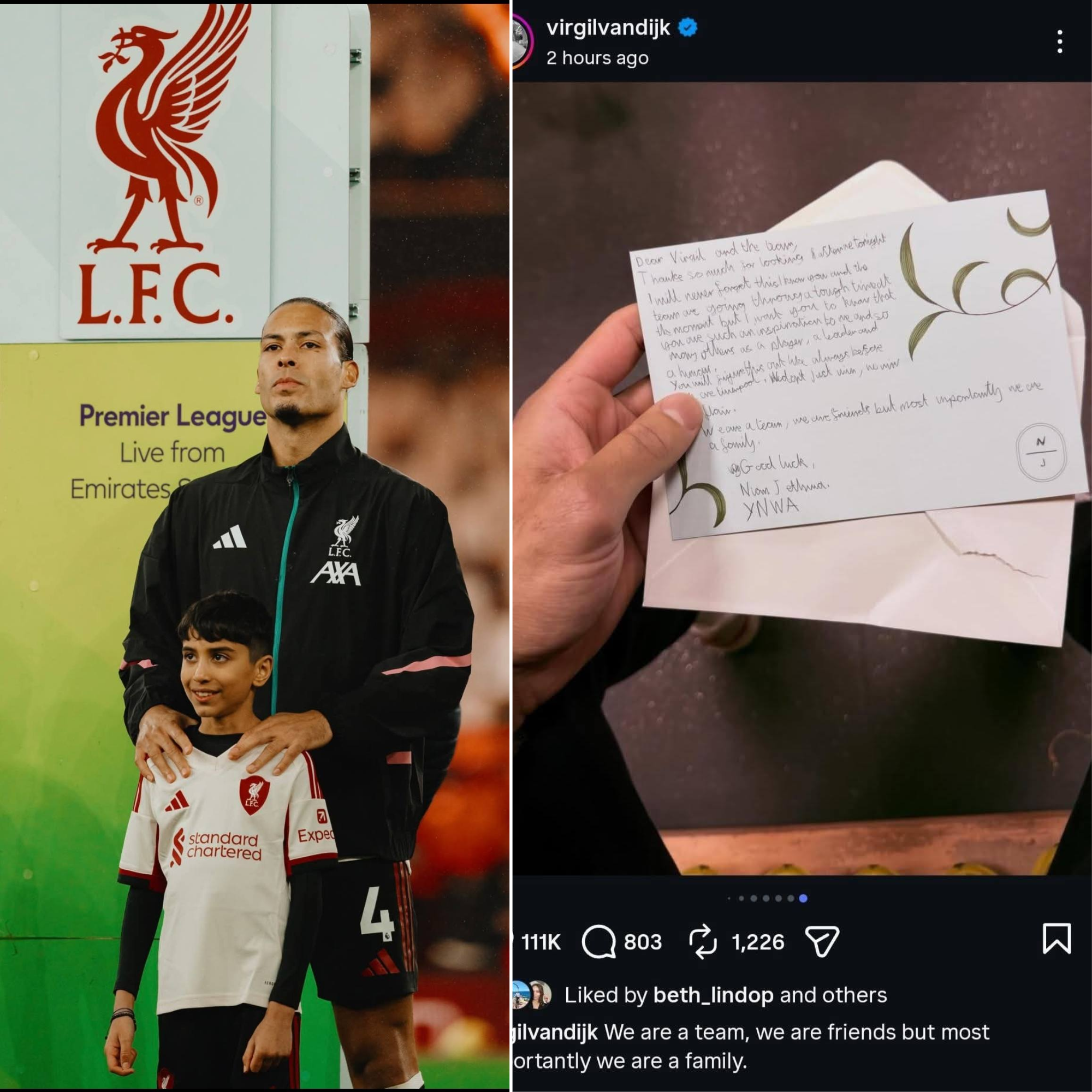 Liverpool captain Virgil van Dijk provided a rare glimpse into the emotional side of professional football on January 9, 2026, when he shared a touching letter from the club’s mascot on his Instagram account after a goalless draw against Arsenal at the Emirates Stadium. The note, penned by the young mascot who accompanied the team onto the pitch, praised Van Dijk’s leadership and offered encouragement during what has been a challenging season for the Reds. Van Dijk highlighted a key phrase from the message—”We are a team, we are friends, but most importantly, we are a family”—in his post, which also included images from the match, including a close-up of the golden Premier League winner’s badge on his sleeve, seen by some as a subtle reminder to Arsenal of Liverpool’s recent championship status.