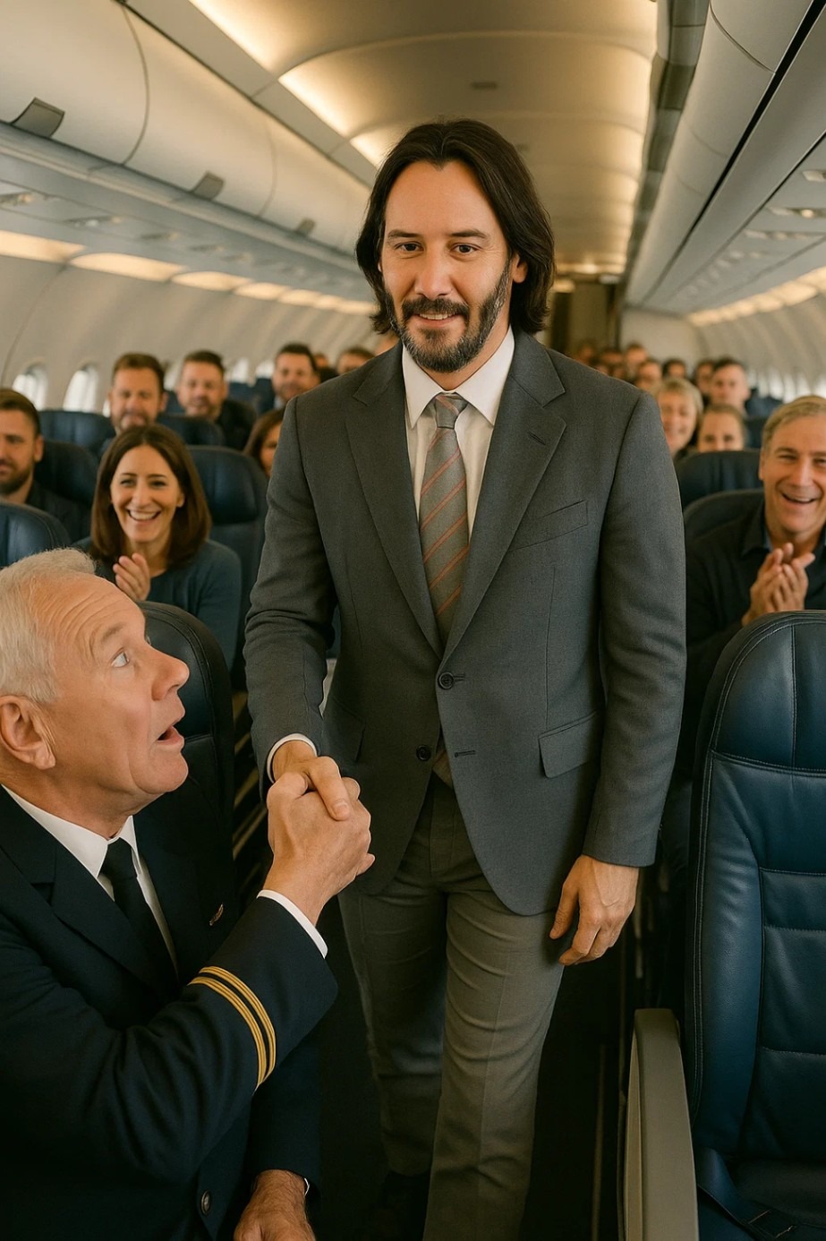 Eventually, the veteran nodded. Not out of entitlement but out of quiet gratitude. Reeves helped him up gently and guided him toward first class, where the crew quickly assisted. Moments later, Reeves sat down in the veteran’s former economy seat — squeezing between passengers who could hardly process what they were seeing.