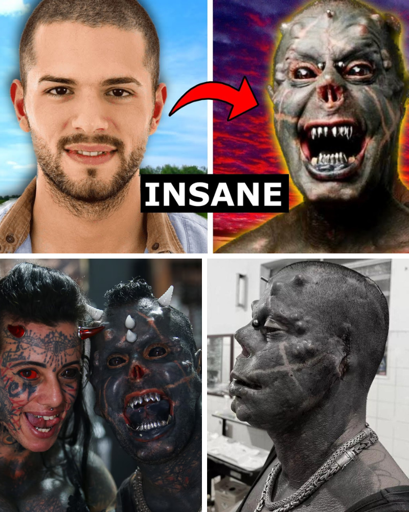 What began as a kid doodling devils on São Paulo sidewalks has spiraled into a transformation so extreme that over 85% of Praddo’s skin is now a black-and-red canvas of flames, skulls and infernal beasts. His tongue is split like a serpent’s, his teeth filed to jagged points and capped in chrome, his fingers fused and amputated into claw-like grips. He’s removed parts of his nose, nipples and navel, implanted horns and subdermal spikes, and even tattooed the whites of his eyes. To the uninitiated, he’s a walking nightmare. To his fans — and there are legions — he’s a bold icon of autonomy in a conformist world.