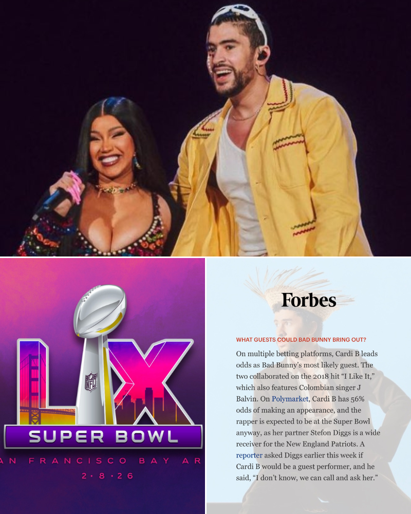 As anticipation builds for the Super Bowl LX halftime performance headlined by Bad Bunny, fans and bettors alike have been closely watching emerging odds and predictions about potential guest performers. According to compiled betting data circulating online, including markets referenced in discussions tied to Forbes Magazine commentary, Cardi B currently leads multiple betting platforms as the top choice to appear as a special guest during the halftime show.