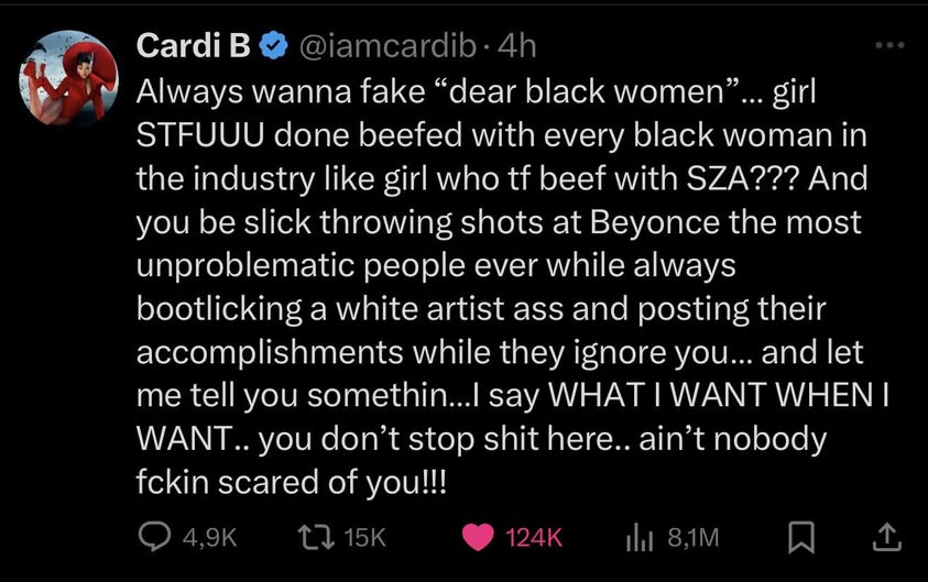 At the heart of Cardi’s recent accusations is Minaj’s perceived inconsistency in supporting Black women. Cardi highlighted Minaj’s earlier disputes with SZA, questioning why Minaj would target “unproblematic” figures like SZA and Beyoncé while publicly celebrating achievements of white artists. “Always wanna fake ‘dear black women’… girl STFUUU done beefed with every black woman in the industry like girl who tf beef with SZA??? And you be slick throwing shots at Beyonce the most unproblematic people ever while always bootlicking a white artist ass,” Cardi posted on October 2, 2025.