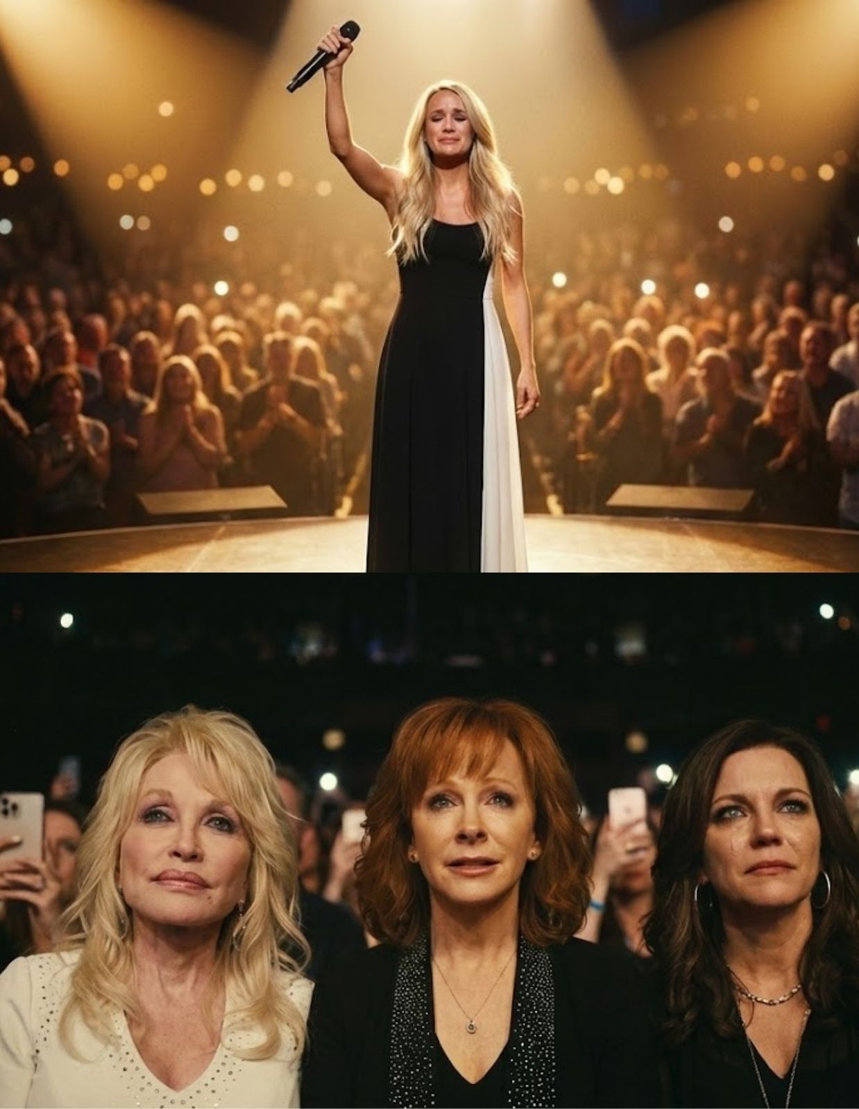 Carrie poured everything into the medley: Starting with echoes of Patsy’s heartbreak, building to Reba’s fire, and climaxing with that soaring, shattering rendition of “A Broken Wing” – a song about rising from pain that felt profoundly personal. Her own tears fell freely on the final note, as if the women who came before were standing right beside her, steadying her, lifting her higher.