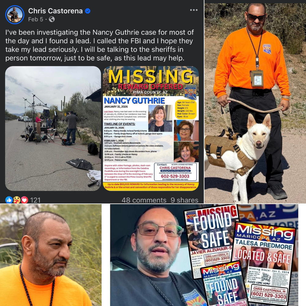 Chris Castorena is known locally in Maricopa as a private investigator, especially for his work on missing children’s cases. He has built a reputation for himself, often describing himself as one of the region’s most popular private investigators. Castorena has claimed to have found a crucial lead in the Guthrie case on February 5, which he reported to the FBI, with the hope that they would take it seriously. The following day, he went to the sheriff’s office to follow up on his findings.