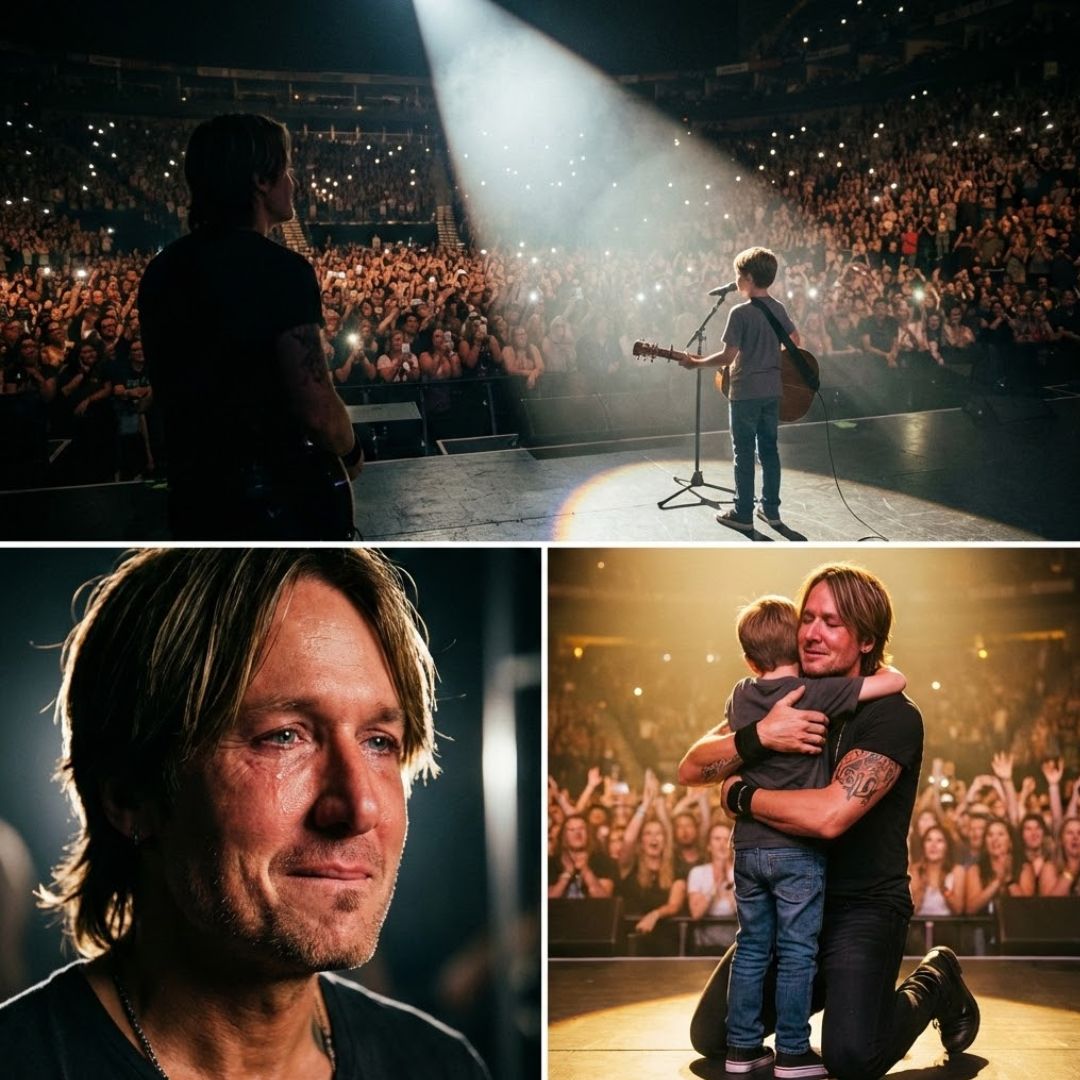 The boy, barely reaching the mic stand, introduced himself softly: “I wrote this for my dad.” With no backing band or accompaniment at first, he began singing a heartfelt original song. His voice was thin, honest, and full of bravery—not polished for the crowd, but directed straight to his father standing offstage, eyes glistening with emotion. Urban didn’t interrupt; he simply listened, absorbing every word as the arena held its collective breath.