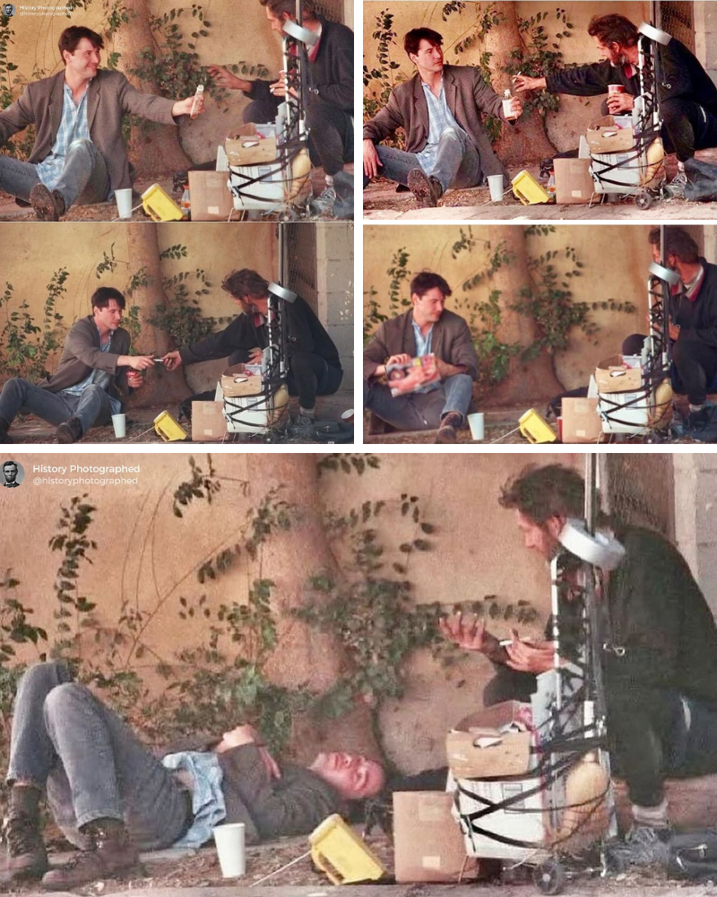 The image in question, snapped by a passing paparazzo in West Hollywood, shows a clean-shaven Reeves—then 33, with his signature tousled hair—in a rumpled suit jacket, sitting shoulder-to-shoulder with an older homeless man on a threadbare blanket. They’re mid-conversation, a half-empty bottle of booze between them, the man’s weathered face lit by a rare smile. Reeves isn’t towering over him in pity; he’s at eye level, legs stretched out like they’re old buddies catching up after a long day. No entourage, no security detail—just Keanu, fully present in a moment most passersby would ignore. “He stayed for hours,” recounted a witness in a 2019 Grazia feature, “listening to the guy’s stories about lost jobs and family, sharing snacks from his pocket. It wasn’t charity; it was just… human.” The photo, which exploded on subreddits like r/KeanuBeingAwesome and r/Damnthatsinteresting, has racked up millions of views, with comments gushing, “This is why he’s the coolest breeze over the mountains.”