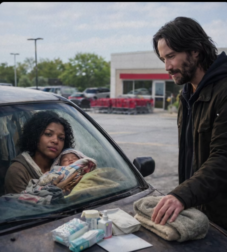 The next morning, the car is still there. Keanu returns – this time not alone in purpose. He carries two large bags from a nearby baby store: formula, diapers, warm new clothes, fresh groceries, and a thick fleece blanket. But he doesn’t stop at dropping off supplies. He gently taps on the window.