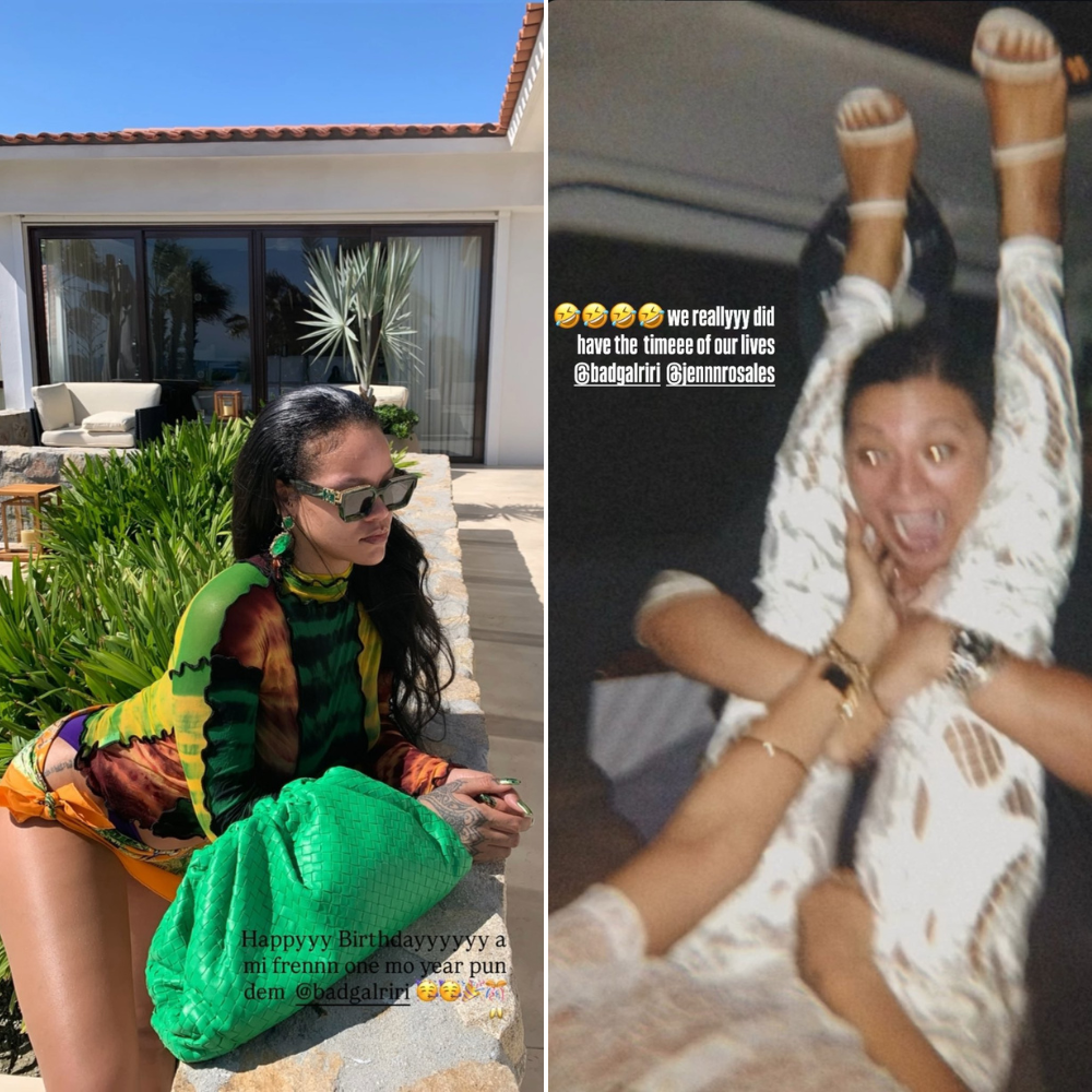 The two-photo post instantly went viral across social platforms. The first picture shows Rihanna seated outdoors near a sunlit villa, wearing a vibrant tie-dye top and holding a bright green woven bag while the California sunlight hits her skin just right. It’s the type of effortlessly stunning candid that reminds the world why Rihanna remains a fashion and cultural icon, even when she’s not trying. In contrast, the second image — a behind-the-scenes moment of Jenn humorously flipped upside-down in a car — brought the chaos, laughter, and pure authenticity that fans adore about Rihanna’s inner circle.