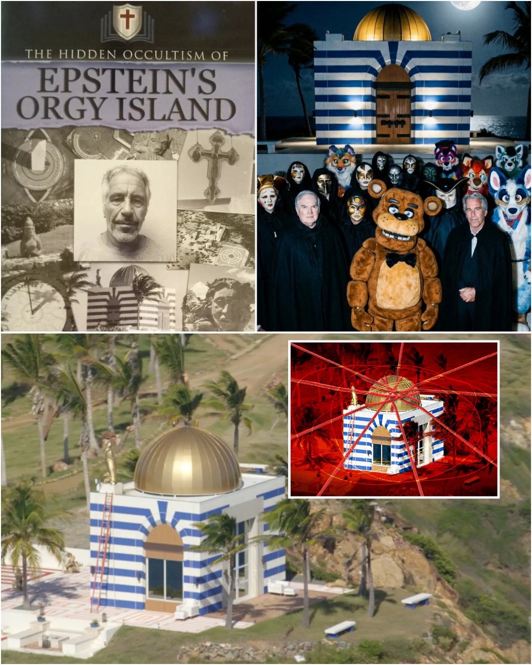 July 2019: Drone footage captures the raid on Little St. James just days after Epstein’s death. The camera pans to that infamous blue-and-white striped “temple” with the golden dome… and what looks like a massive, ancient wooden door guarded by eerie statues.