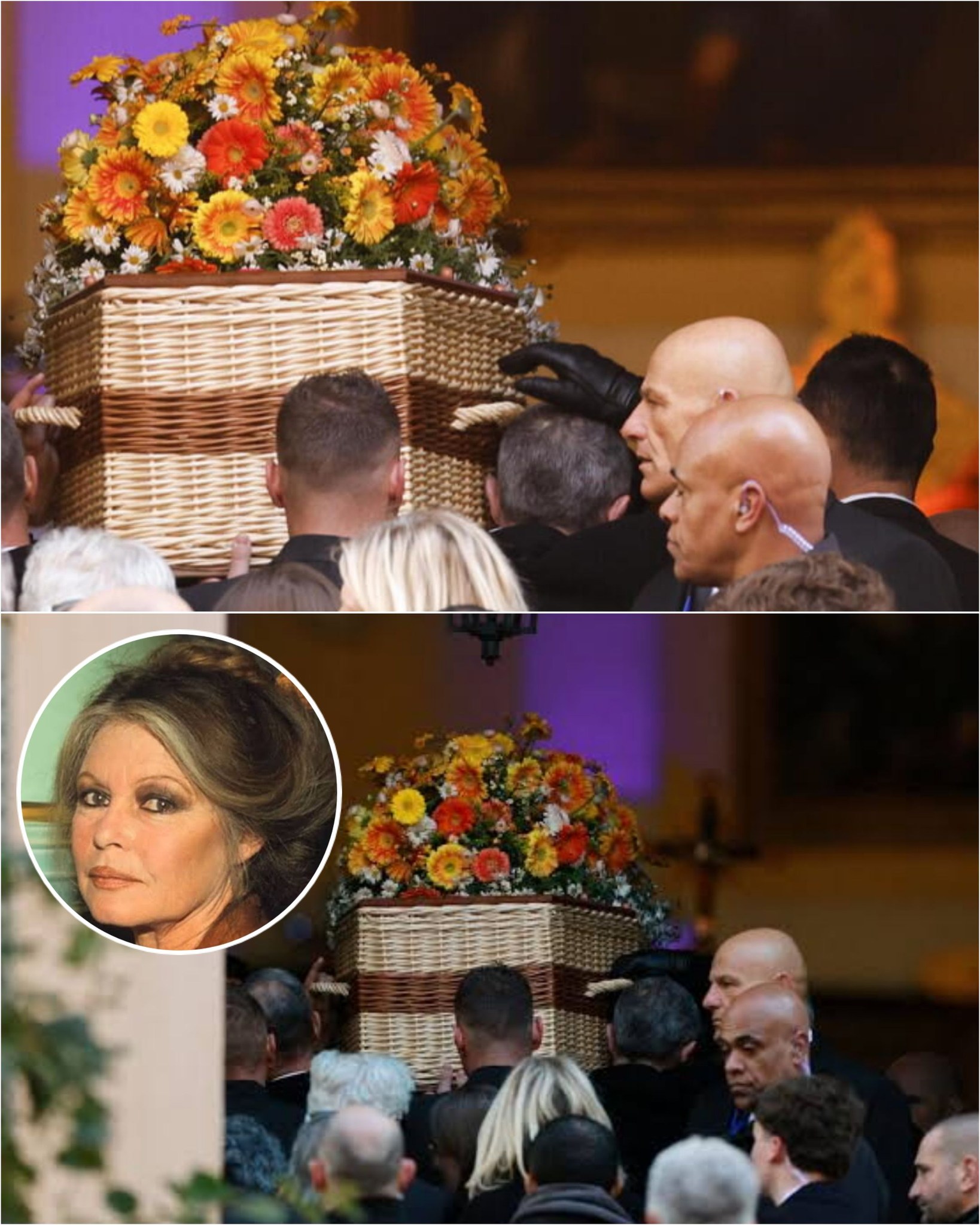 Outside the church, the mood shifted to one of public tribute. Large screens broadcast the service across the town, allowing residents and fans to follow along. As Bardot’s coffin—adorned with vibrant orange and yellow flowers—was carried out and driven through the narrow cobblestone streets, crowds lined the routes, many applauding in a spontaneous show of respect. A black-and-white photo of Bardot embracing a baby seal, symbolizing her passionate animal advocacy, was displayed near the casket with the words “Merci Brigitte.”