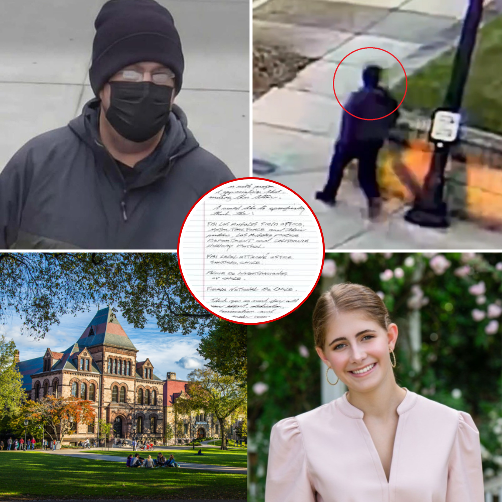 The chilling video, captured from campus and nearby residential cameras, shows the suspect – dressed in dark clothing – methodically trailing Ella as she went about her day on the Ivy League campus. In a particularly disturbing moment at the 37-second mark, the figure brushes past her in a hallway, subtly slipping a piece of paper into the pocket of her jacket without her noticing. Ella, described by friends and family as a vibrant, kind-hearted young woman, appeared completely unaware of the lurking danger.