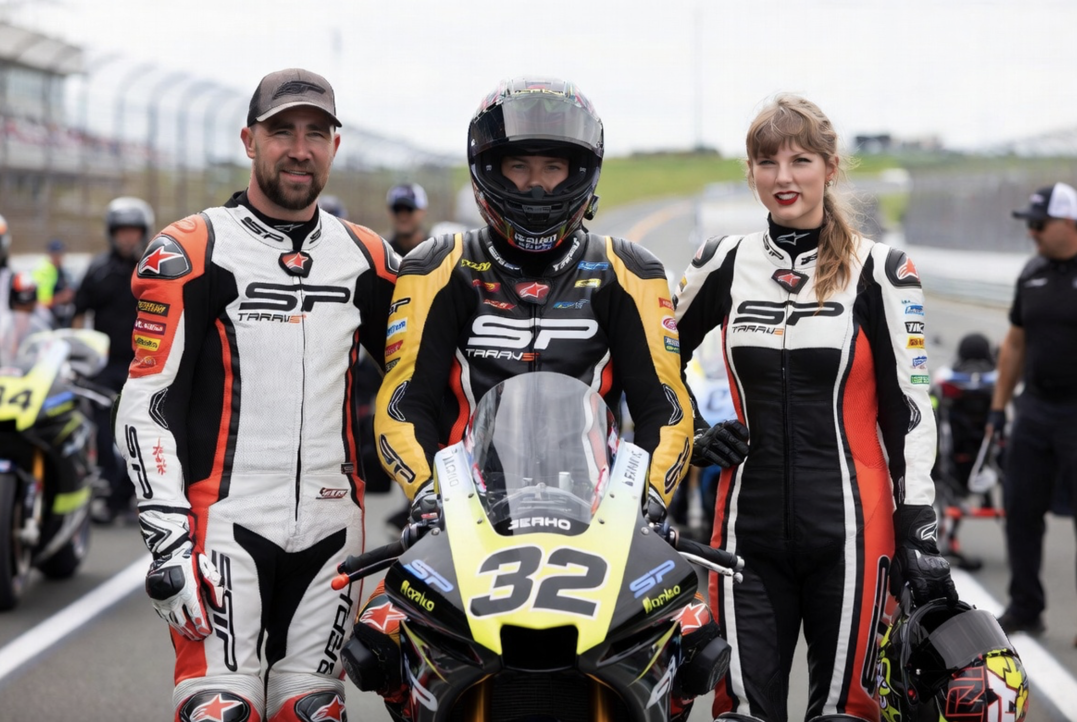 According to stories rapidly spreading across social media, the duo didn’t just pose for photos. They suited up in full racing gear, helmets gleaming under the track lights, and climbed aboard sleek, high-performance motorcycles. Kelce, with his athletic build and fearless attitude honed on the football field, looked right at home twisting the throttle. Swift, ever the fearless adventurer off-stage, matched his energy with surprising skill and enthusiasm.