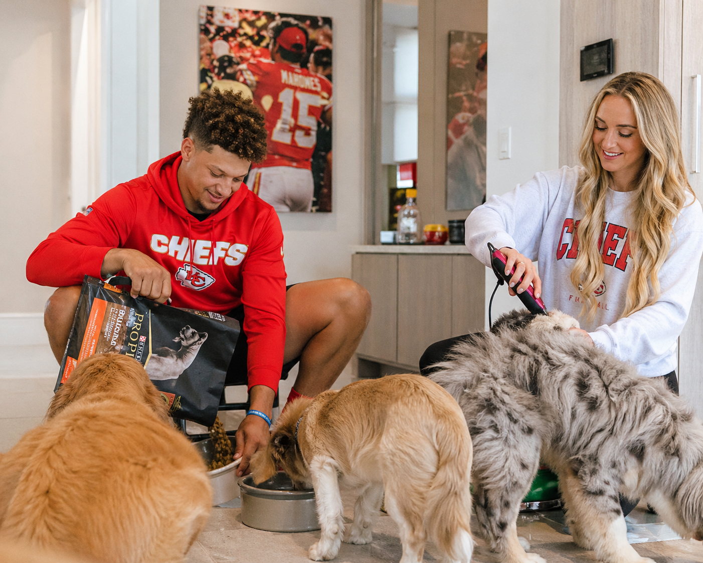 Patrick, known for his calm leadership on the field, showed the same quiet strength off it. “These dogs didn’t have a voice, but they had a chance,” sources close to the family shared. Brittany, a devoted mother and passionate advocate for animals, was right by his side, ensuring each new family member received immediate veterinary care, toys, and a safe space to adjust. Their existing dogs, Steel and Silver — longtime members of the Mahomes household with their own metallic-themed names — reportedly welcomed the newcomers with curious sniffs and playful energy.