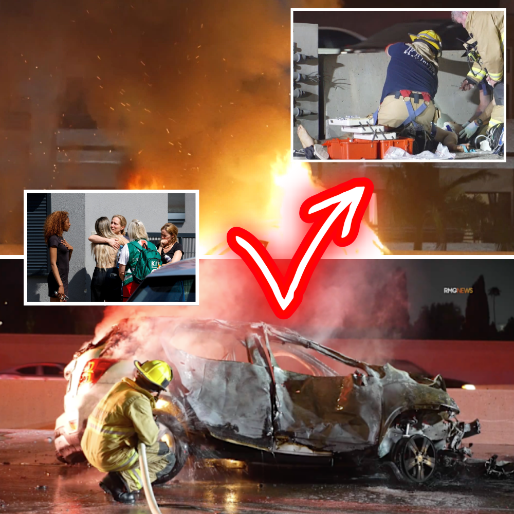 A dramatic multi-vehicle collision on a busy Southern California freeway ended with one car engulfed in flames, forcing rescuers to assist victims at the scene as thick smoke and explosions lit up the night sky.