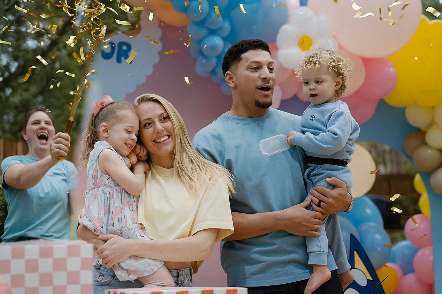 Sterling squealed, Bronze pumped his fist yelling “Touchdown!”, and Golden clapped her tiny hands, oblivious but beaming as if she’d scripted the whole thing. Confetti cannons—Brittany’s idea, naturally—exploded in a shower of pink and blue, but the real surprise? A custom ultrasound photo propped against the cake, revealing the newest Mahomes: a baby boy, due in late summer, ready to carry the torch with a name whispered in family lore—perhaps Platinum, shining bright like his dad’s legacy.