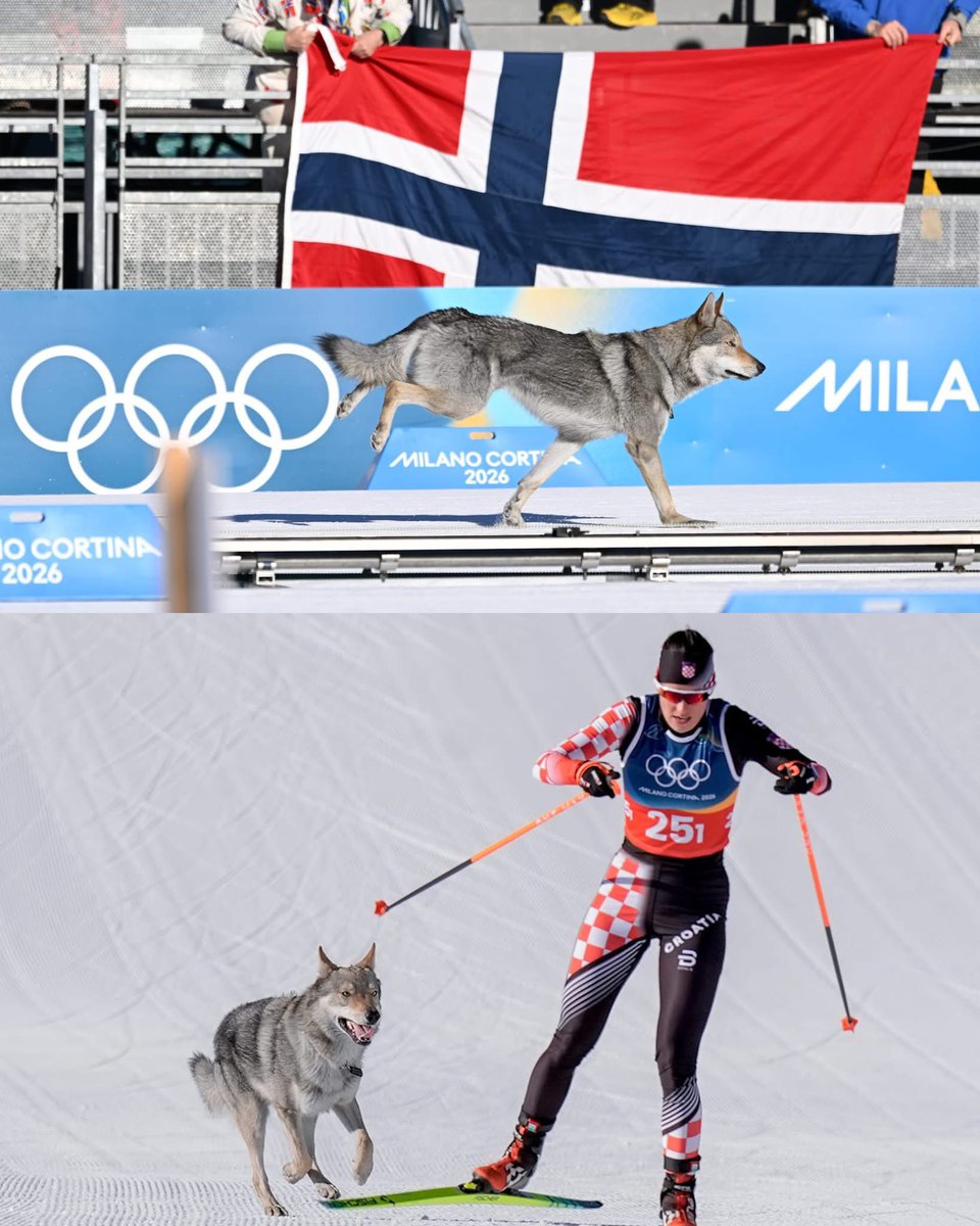 Under the dazzling lights and roaring crowds of the Milano Cortina 2026 Winter Olympics, one of the most surreal moments unfolded during the women’s cross-country team sprint qualifiers in Tesero, Italy. As exhausted skiers powered toward the finish line, a large, silver-grey figure suddenly burst onto the groomed snow track, sprinting alongside the athletes with astonishing speed and determination.