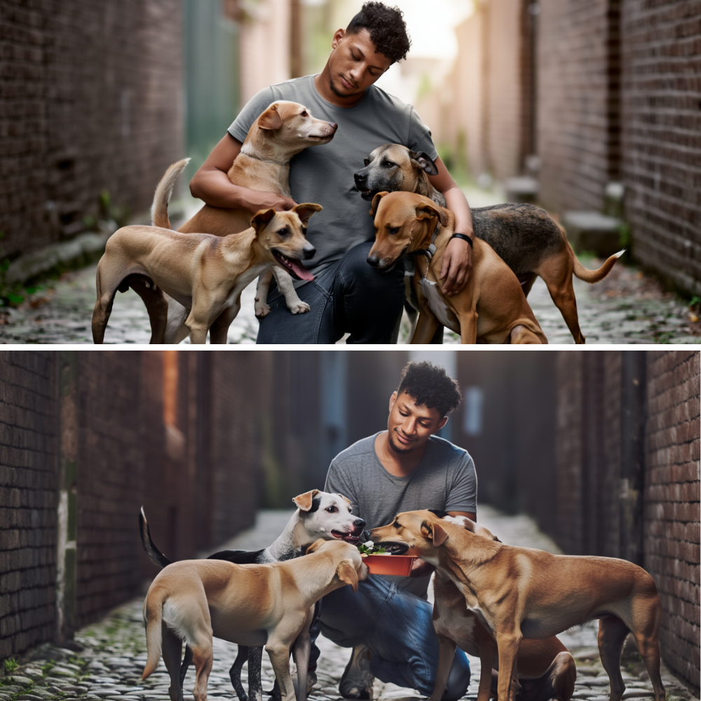 In the dim, narrow alleyway of a rundown Kansas City neighborhood, where the summer heat clung to cracked concrete like a bad memory, 23 stray dogs huddled together in desperate silence broken only by their faint, echoing whimpers. Abandoned by owners who’d moved on to easier lives, these mutts— a mix of scruffy terriers, lanky hounds, and wide-eyed pups—hadn’t eaten in days. Their ribs protruded like fragile xylophones under matted fur, and their eyes, once bright with puppyish wonder, now dulled with the weight of survival. The alley, tucked behind a row of forgotten warehouses, was a world away from the roar of Arrowhead Stadium, where cheers erupted for touchdowns and glory. Here, the only audience was the indifferent hum of distant traffic.
