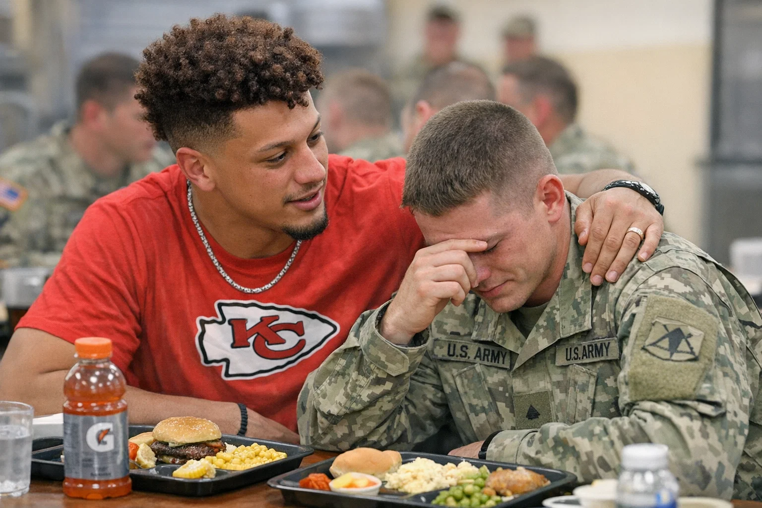 The turning point came when a young enlisted soldier, fresh from basic training, opened up about his dreams. Amid the clatter of trays and casual chatter, he spoke candidly—perhaps about family back home, aspirations beyond the uniform, or the uncertainties that come with deployment. The room fell quieter as he shared. Then, without fanfare, Mahomes rose from his seat.
