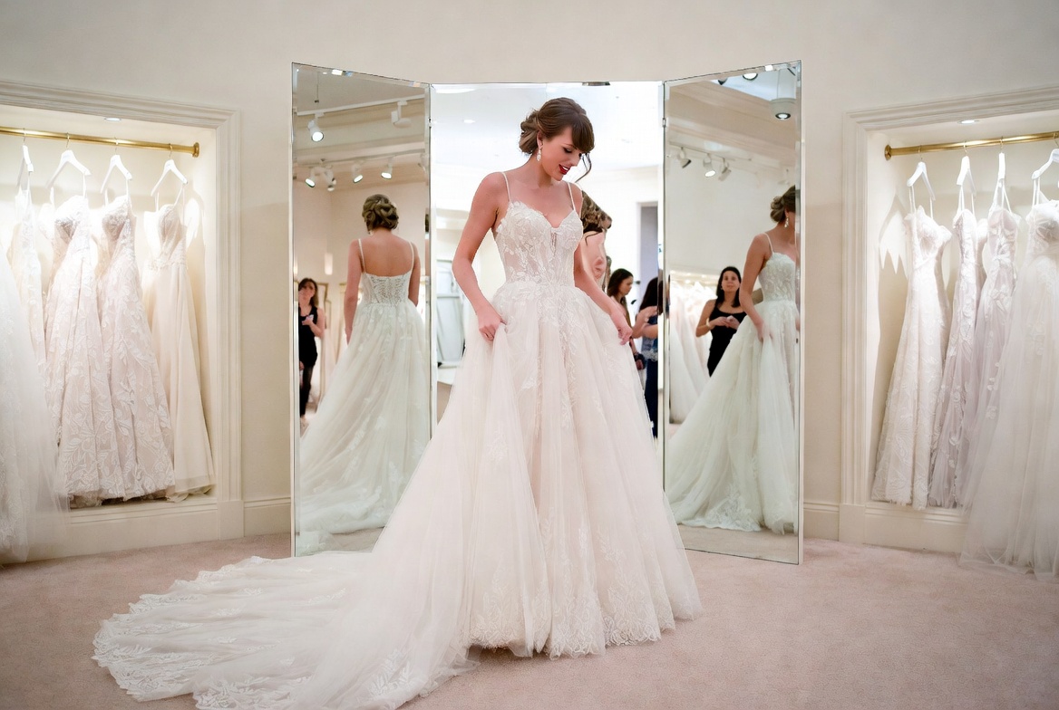 Picture this: the soft glow of boutique lights, racks of shimmering gowns, and the unmistakable sparkle of Taylor Swift trying on wedding dresses. But wait—add in two giggling little girls, twirling in pint-sized versions of the bridal magic, and you’ve got a scene straight out of a feel-good rom-com. Recently, pop icon Taylor Swift and her NFL star beau, Travis Kelce, turned a routine bridal fitting into a family affair, bringing along Travis’ adorable nieces, Wyatt and Elliotte. Captured on video by a delighted store employee and shared across social media, these precious moments have melted hearts worldwide, racking up thousands of likes, shares, and comments gushing over the pure, unfiltered joy.